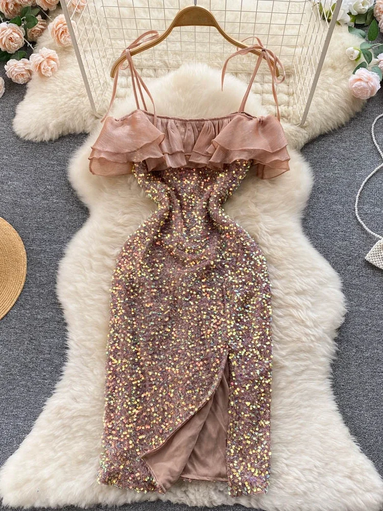 Trackpodssl Sequins Party Dress – Sexy Off Shoulder Ruffles Midi Dress