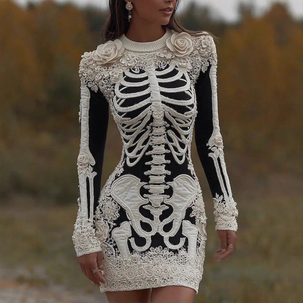 Make a bold fashion statement this season with our Halloween skeleton bodycon dress, featuring 3D digital printing for a striking gothic effect. Designed in a slim-fit hip skirt silhouette with long sleeves and a classic crew neck, this dress blends street style attitude with feminine elegance.