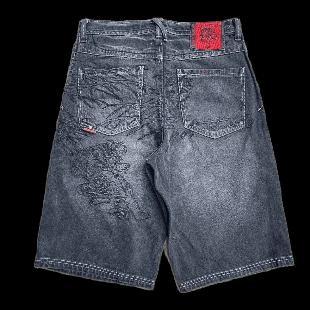 Hyhis Summer New Casual Shorts Hip Hop Goth Y2K Shorts for Men Embroidery Retro Black Denim Gym Basketball Pants Wide Leg Streetwear Size Table S Waist:72cm Hips:106cmM Waist:76cm Hips:110cmL Waist:80cm Hips:114cmXL Waist:84cm Hips:118cm2XL Waist:88cm Hips:122cmSize mearsured by ourselves, sometimes has some errors, but always within 3cm." Please note 1 cm = 0.39 inch,1 inch = 2.54 cm.