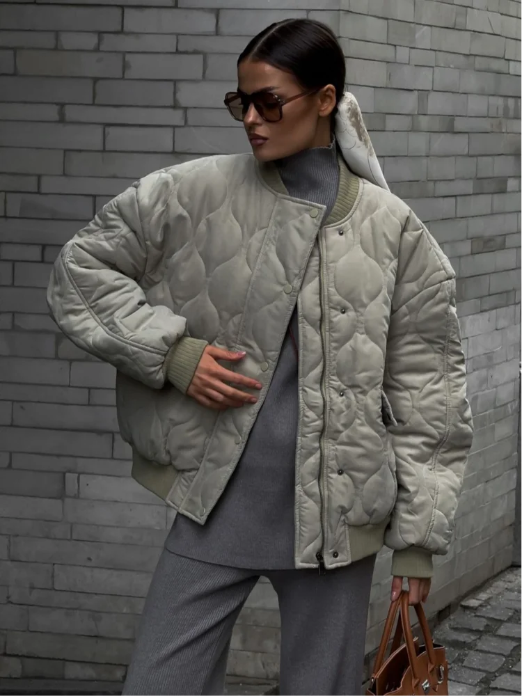 Lvpinyuan fall outfits 2025 Women Classic Solid O-neck Quilted Bomber Jackets Chic Single Breasted Zipper Full Sleeves Cotton Coats Lady Loose Outwear