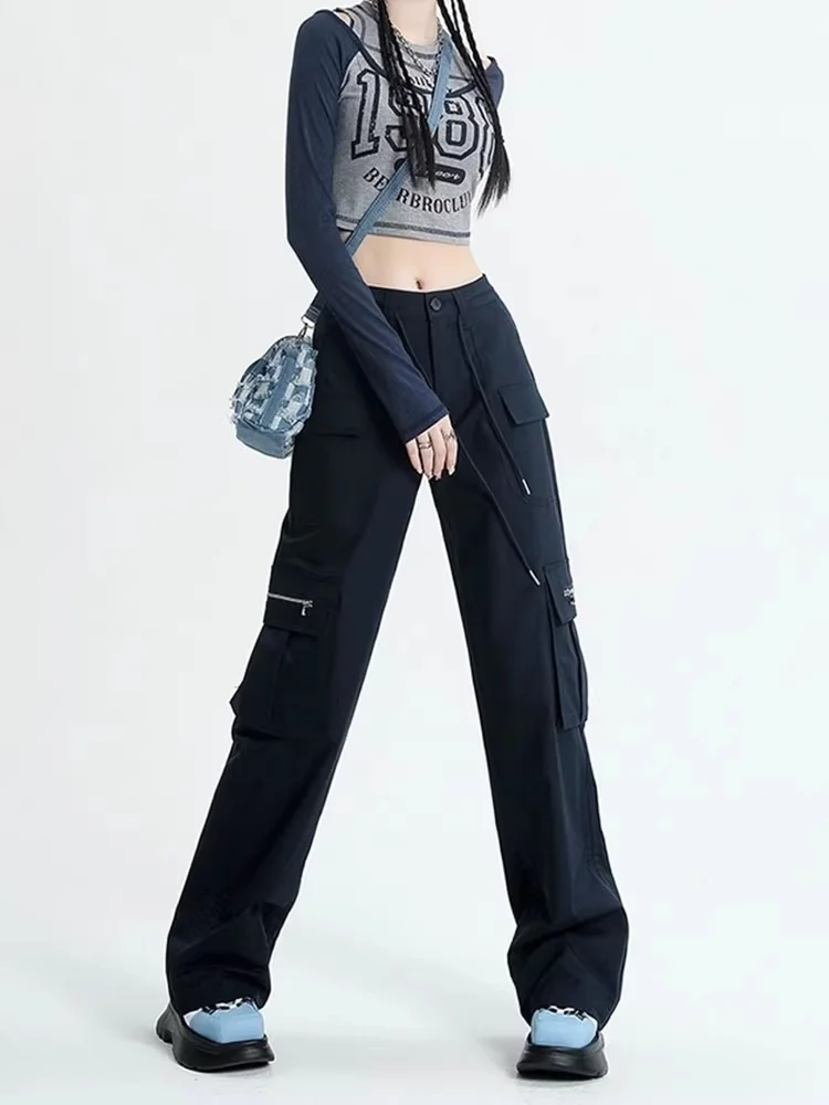 Ohanaparts American Retro High Street Casual Overalls Solid Color Loose Wide Leg Pants Women Hip-hop Drawstring Cargo Y2k Grunge Trousers