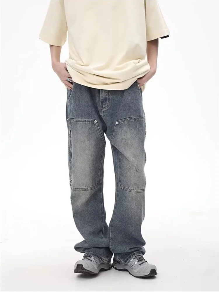 High Street Fashion Brand Made Old Wash Zipper Pocket Woodcut Jeans Vintage Loose Straight Leg Pants Women's Jeans