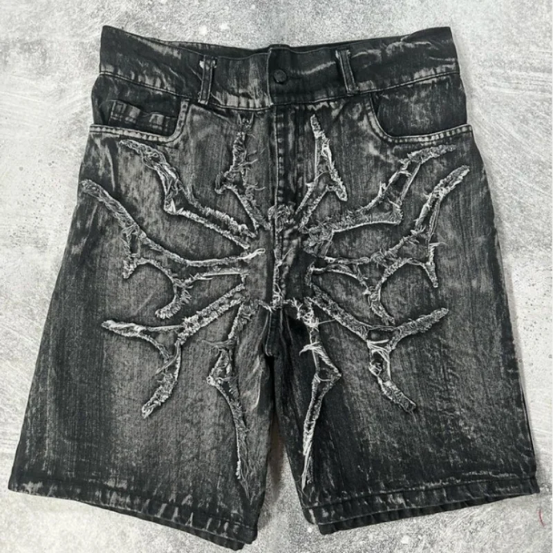 Spider web geometric pattern embroidery high quality design baggy denim shorts mens y2k old washed personalized basketball short Size Table