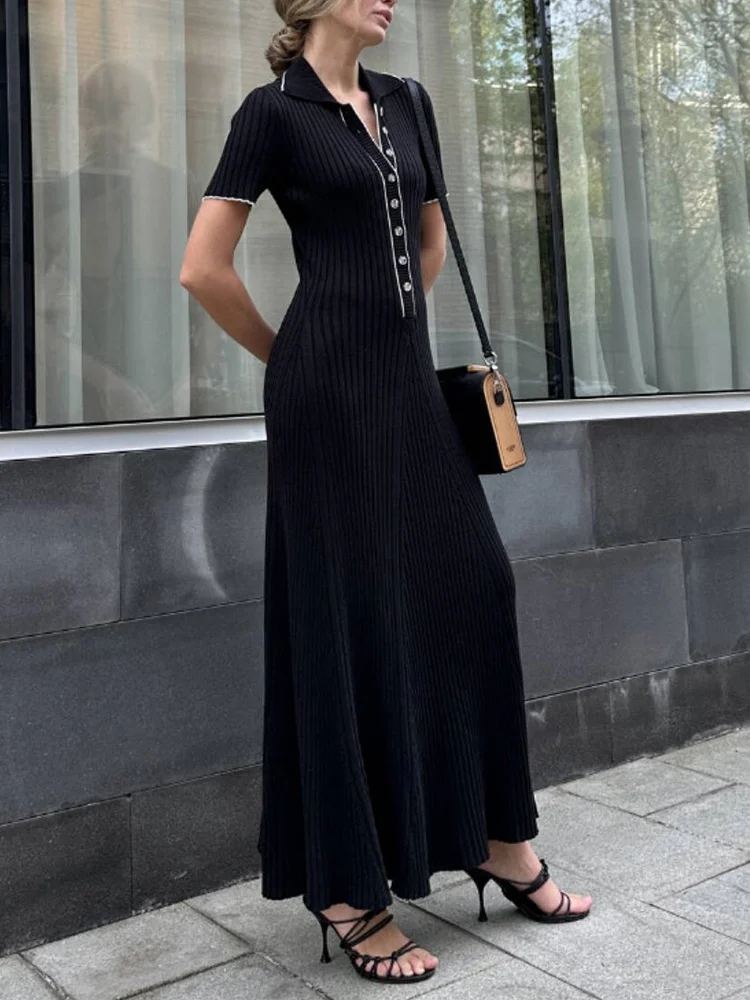 Efenbei Summer Elegant Women’s Knitted Dresses Fashion Black Short Sleeve Maxi Dress Lapel High Waist Slim Dress 2025 Woman Clothes