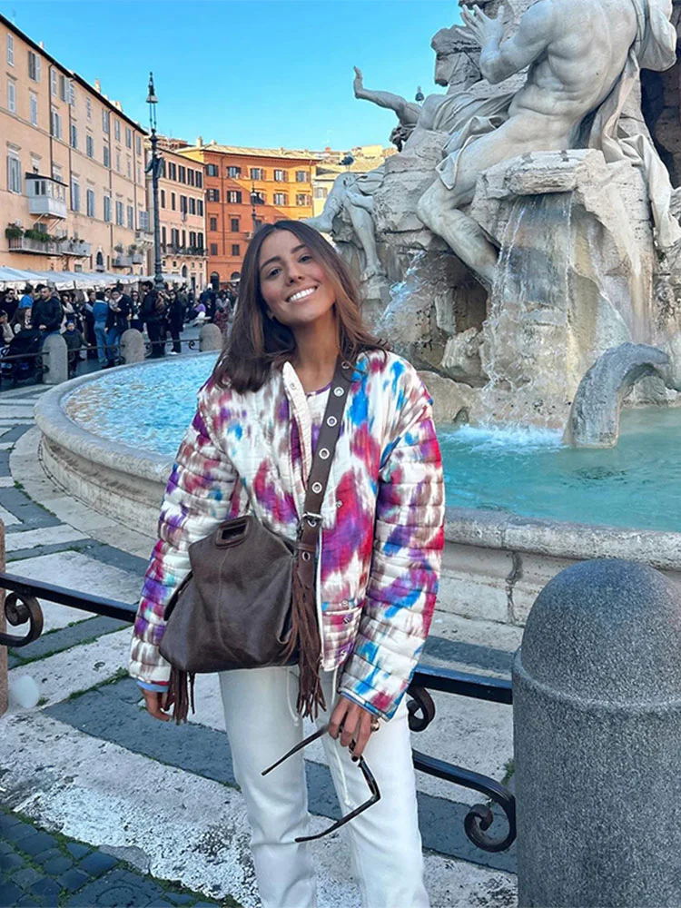 Lvpinyuan fall outfits Elegant Tie Dyed Print Cropped Quilted Cotton Coats Fashion Pockets O Neck Full Sleeves Short Jackets 2025 Female Street Outwear